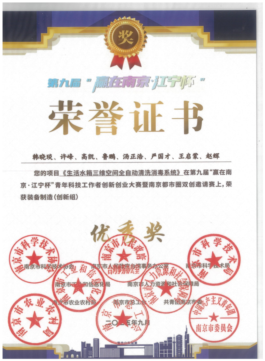 近日,在第九届“赢在南京·江宁杯”青年科技工作者创新创业大赛暨南京都市圈双创邀请赛中,溧水环境集团清泉建设科技公司研发的“生活水箱三维空间全自动清洗消毒系统”,凭借其突出的创新性与社会价值,荣获装备制造(创新组)优秀奖。该系统致力于实现水箱清洗的全面自动化与智能化,为提升公共卫生安全提供了创新的技术解决方案。